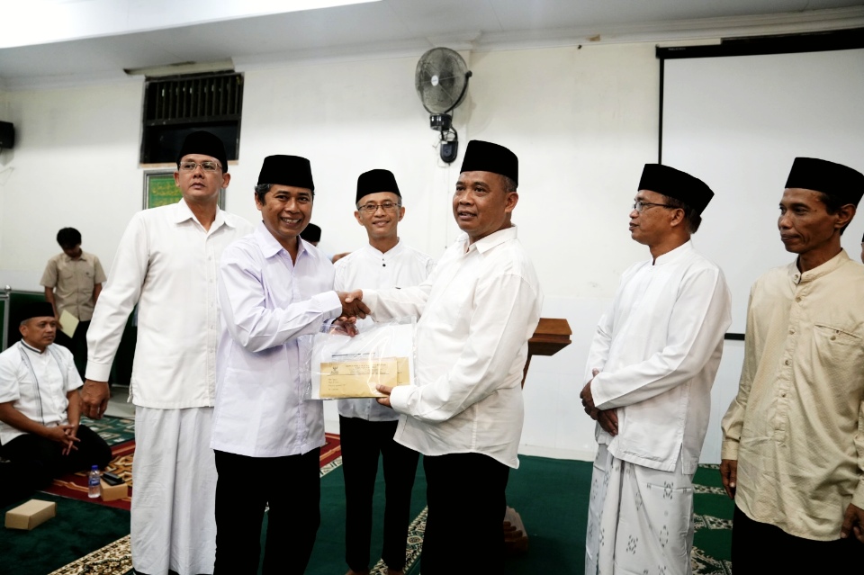 Bupati Harda Kiswaya menyerahkan bantuan dana Rp27 juta kepada takmir Masjid Al Falah didampingi Wabup Danang Maharsa (kiri). (PM-ist)