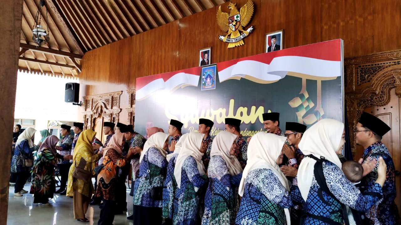 Lurah beserta staf Pemkal Condongcatur dan lembaga kalurahan saling bersalaman pada acara Syawalan di Pendopo Kromoredjan. (PM-Dok.Humas)