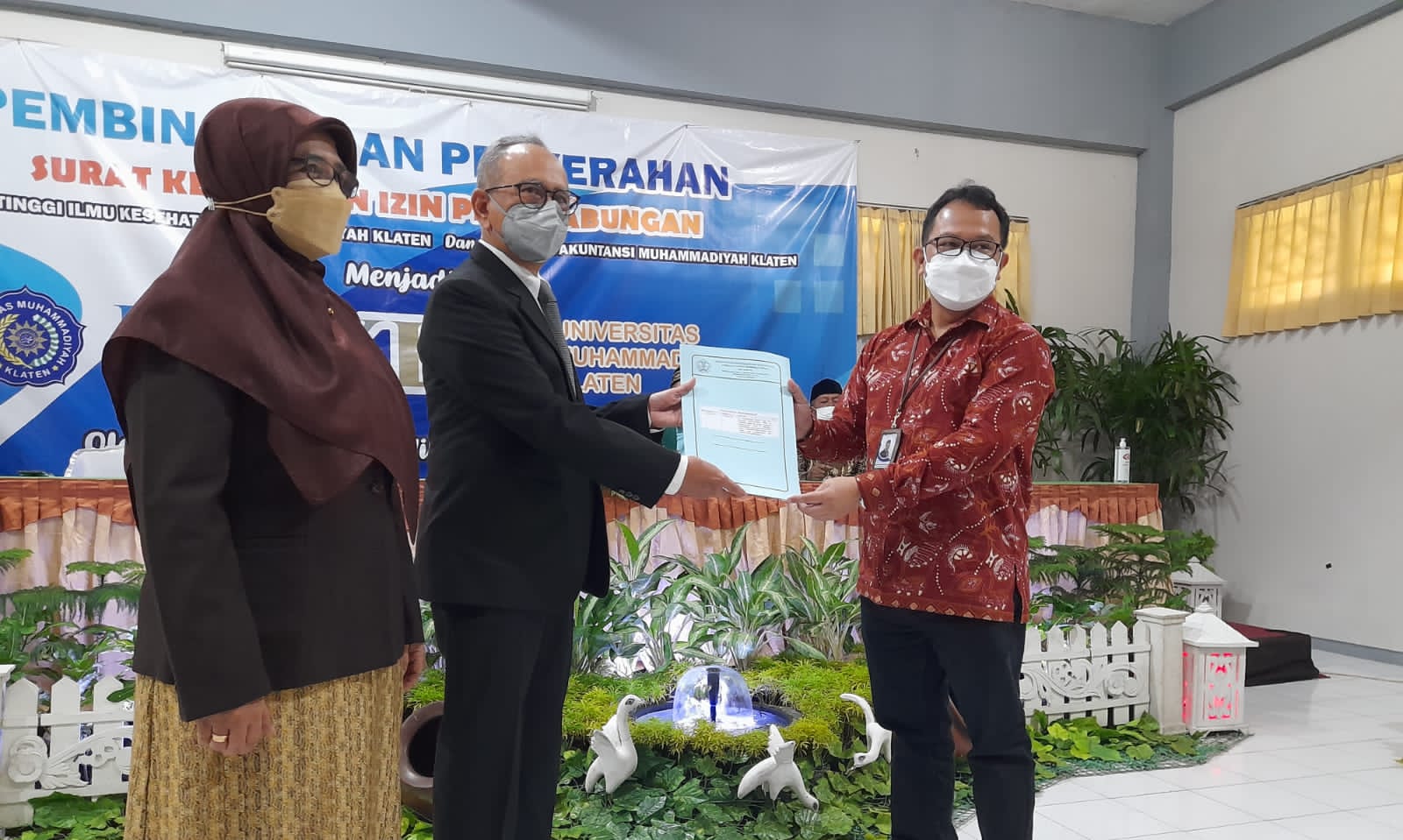 Klaten (PM) – Lembaga Layanan Pendidikan Tinggi (LLDIKTI) wilayah VI Jawa Tengah, Senin (07/03/22) menyerahkan surat keputusan izin penggabungan Sekolah Tinggi Ilmu Kesehatan Muhammadiyah Klaten dan Akademi Akuntansi Muhammadiyah Klaten menjadi Universitas Muhammadiyah Klaten.
